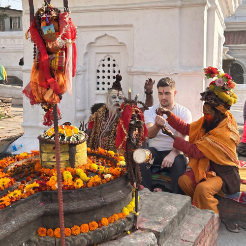 Urmează vizita la Swayambhunath, cunoscut și ca „Templul Maimuțelor”, unul dintre cele mai vechi și sacre situri budiste din Nepal. Situat pe o colină cu panorame spectaculoase asupra orașului, complexul este dominat de o stupă veche de peste 2.500 de ani, decorată cu simbolicii „ochi ai lui Buddha”.
